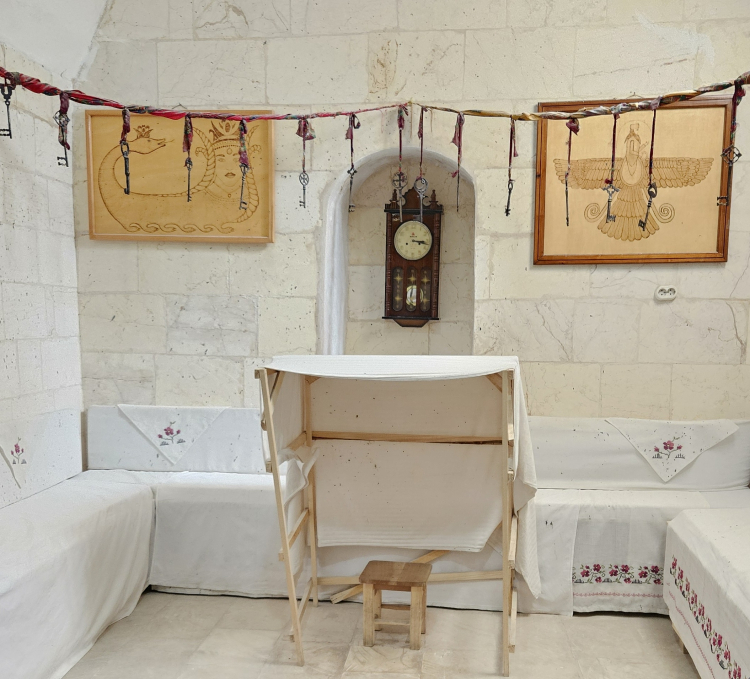 Yaşayan Müze’nin diğer bir odası ‘Kurşun’. 5 bin yıllık bir tarihe sahip kurşun dökmek. Ne kadar Türklerin bir ritüeli olarak geçse de Almanlar da yeni yıla arınarak girmek için, İskandinavlar yeni evli çiftler için kurşun döktürüyorlarmış. İşin özü, kötü enerjinin, nazarın uzaklaştırılması. Kurşun odasındaki anahtarlar ise Mardin evlerine ait eski anahtar örnekleri. Dinleri, toplulukları temsil ediyor.