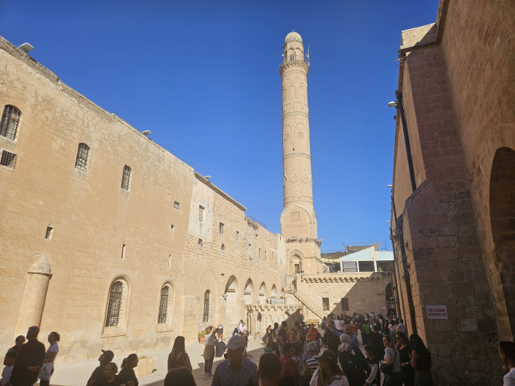 Telkari Atölyesi’nde gümüşlerin nasıl takı haline geldiğini dinledikten sonra Mardin çarşısından uzanan yolun sonu bizi Mardin Ulucami’ye çıkarıyor. 1176 yılında inşa edilen bu caminin minaresinde Nur Suresi’nin 36. Ayeti, Kelime-i Tevhid, Ayetel Kürsi, sahabe isimleri yazıyor. 8 adet boş kapı, cennetin kapılarını simgeliyor ki biri Mardin Kapı.